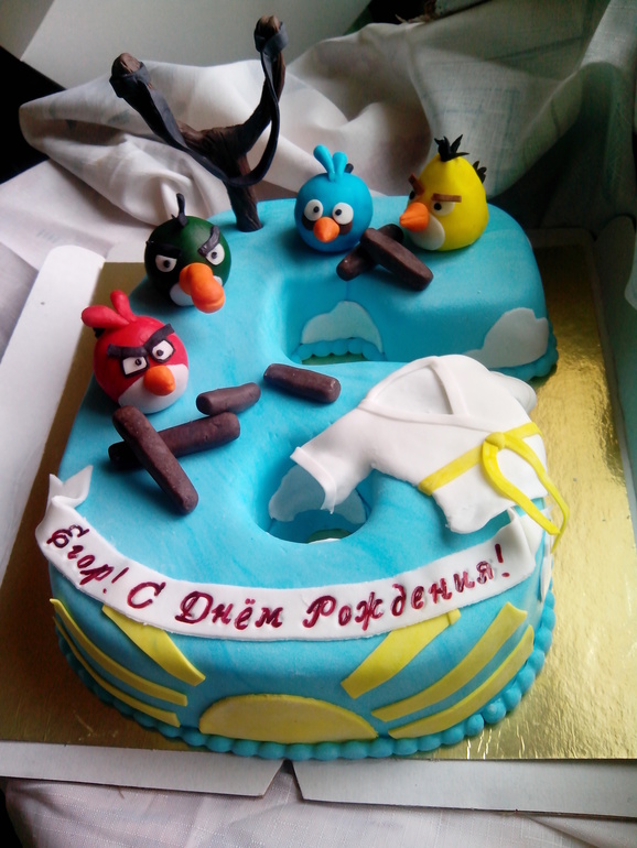Делала вот такой торт для мальчика, который обожает злобных птичек и занимается дзюдо.С заказчицей попытались объединить всё)