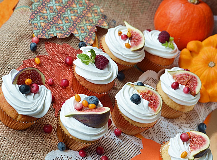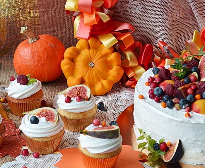 Торт 3 кг, ванильный шифоновый бисквит, крем - сливки и маскарпоне, малина, голубика и белый нектарин. Украшение - белковый крем и свежие ягоды, в том числе мои любимцы - инжир и облепиха.Капкейки ванильные и ореховые с вишней, апельсином и абрикосом.