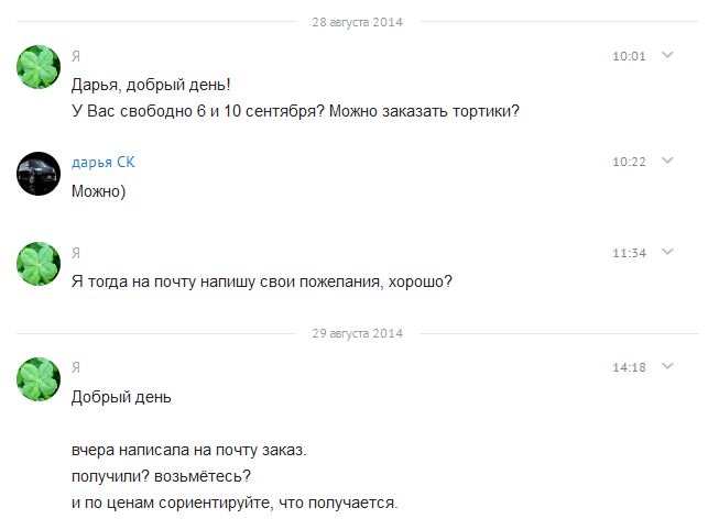 В результате - > торта нет. Кондитер удивлена, ничего я у нее не заказывала. Она вообще в больнице. Интернета у нее 10 дней как нет нет, ничего не писала ,ничего не подтверждала. Кто мог написать от ее имени - она не знает.