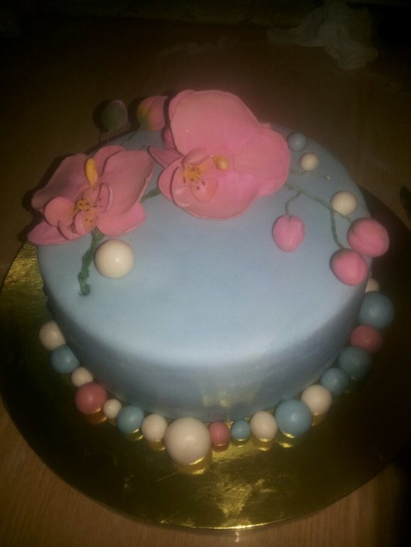 Квадратный тортик очень хорош) На первом тортике бусины очень большие и надо было лепестки цветочков высушить отдельно,чтобы они держали форму.Когда делаете орхидеи и другие цветы,смотрите на картинку,чтобы цветы были похожи,а эти не совсем орхидеи получились.Лунтик выровнен не очень хорошо,и не очень аккуратный — мордочка испачкана