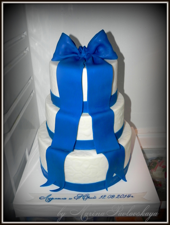 По всем ярусам должен был быть узор из айсинга. Я взяла айсинг Меджик. Развела по инструкции. Добавила голубой краситель. Нанесла на нижний ярус. Отправила торт в холодильник. Айсинг потек... Все узоры сползли... Перепсиховала... Убрала весь сползший айсинг, стерла все синие подтеки с торта водкой... Позвонила заказчице.... Дико извинялась и предупредила, что торт без узоров...