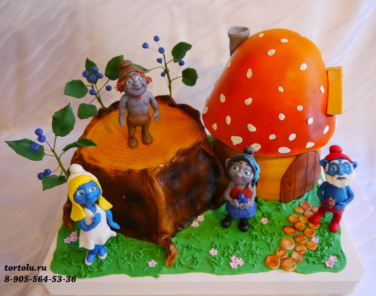 Вес 6 кг. В пенечке "Пьяная вишня", в грибочке ванильный шифоновый бисквит, сливочно-маскарпоневый крем, голубика, малина.
