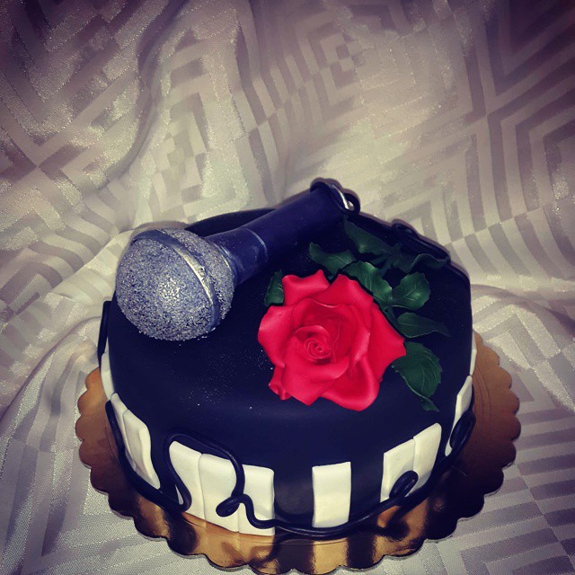 Вот такой получился тортик. Мама доче заказала,которая мечтает быть певицей; просила черный и с микрофоном, а я уже от себя розу добавила,и немножко блесток, а то уж совсем грустно...