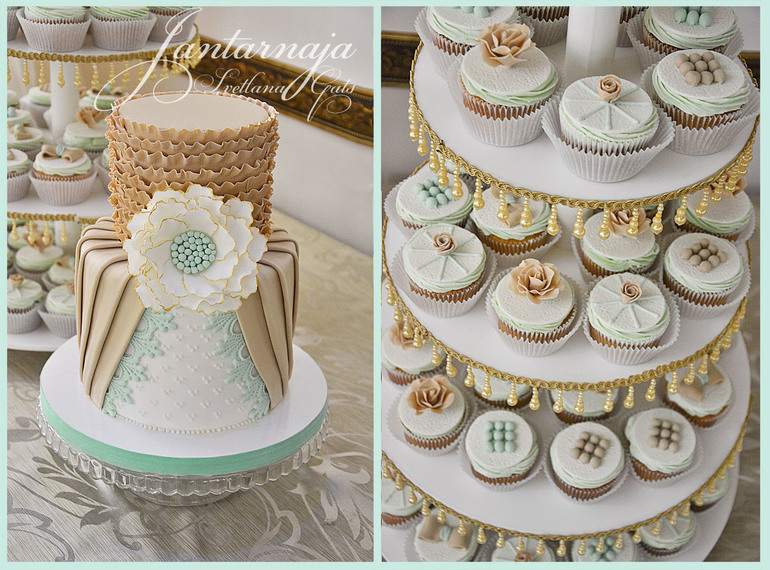 Торты свадебныеВот такой кружевной тортик и капкейки посчастливилось сделать. Что меня приятно удивило, так это сочетание карамельного и мятных цветов. Тортик на 5 килограмм и 70 капкейков