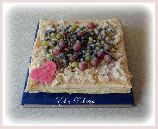 и снова Наполеон с заварным кремом, украшен виноградом, лепестками миндаля, шоколадными трубочками