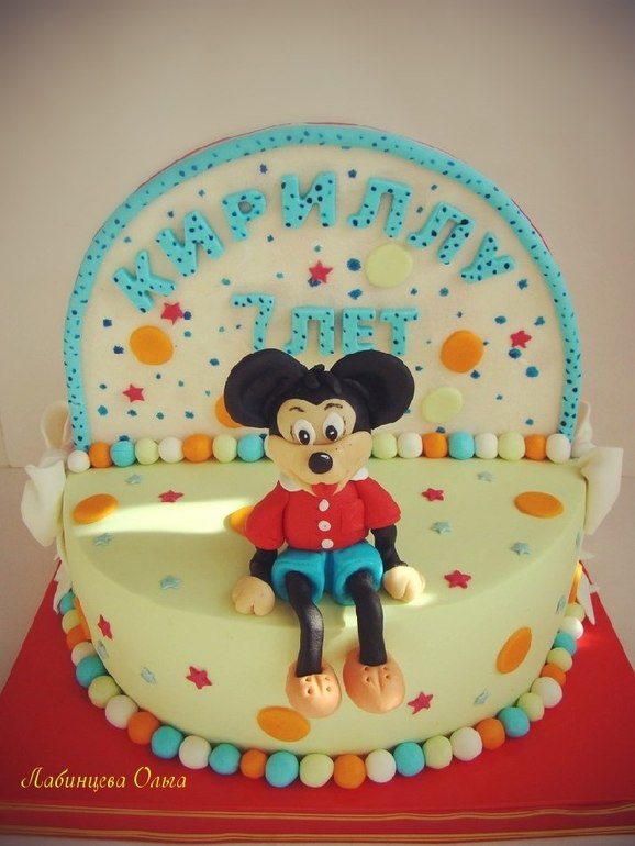 Торты детскиеПод мальчиком медовик с черносливом и орешками, под девочкой шифоновый светлый бисквит, пломбирный крем с вишней и шоколадной крошкой. Сахарная стеночка. Вес 3 кг.