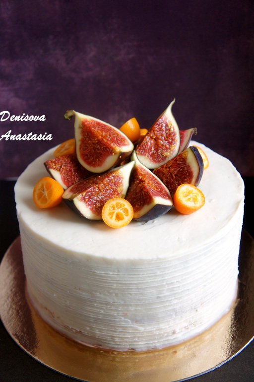 Украшение тортов кремом,шоколадом, фруктамиБелый бисквит, чередование ванильного и клубничного мусса) Вес 2 кг 100 гр, по счастливой случайности нашла у нас свежий инжир ))
