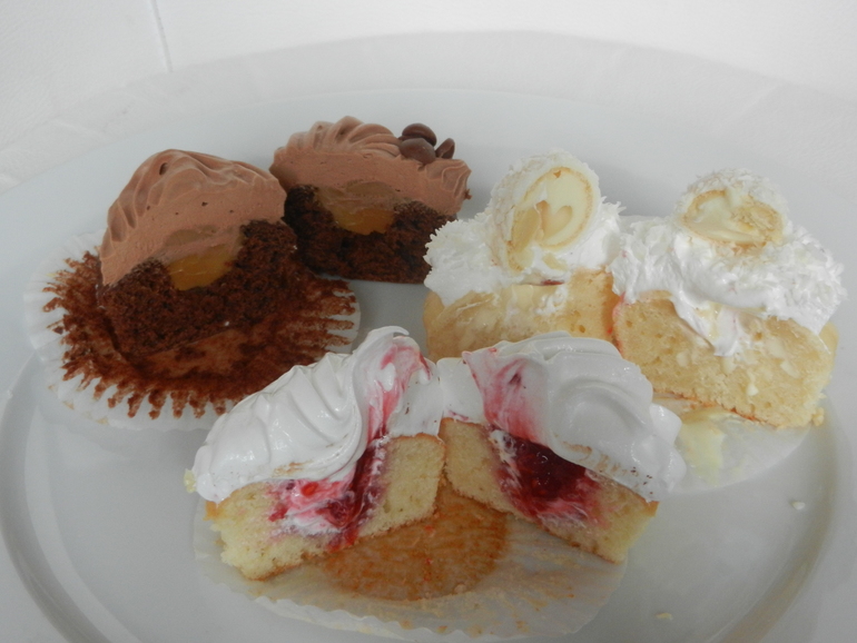 шоколадные с вареной сгущенкой и шоколадным кремом, творожно-малиновые с меренгой и Рафаэлло