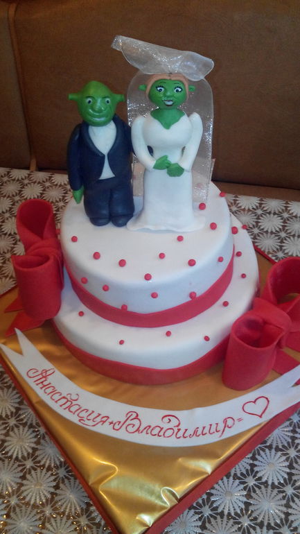 Торты свадебныеПрактически 5 кг.Ванильный бисквит,творожно-йогуртовый крем,вишня и клубника. Фиона в фате,потому что,страшна изрядно))))