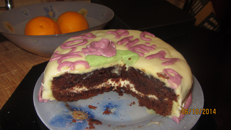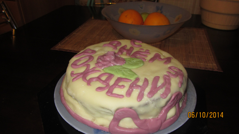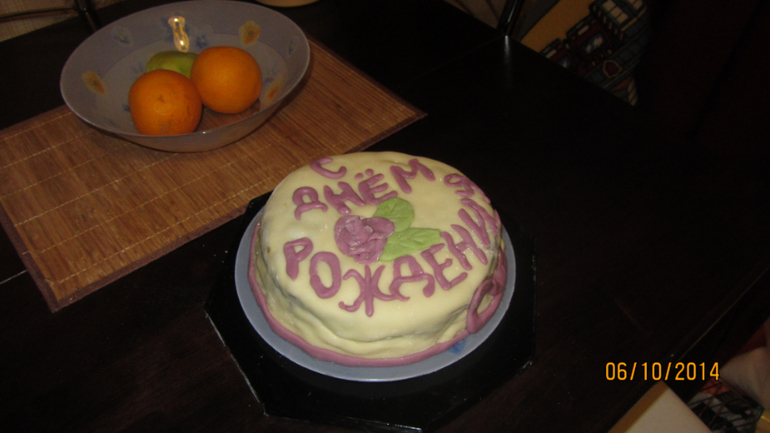 мммм..... под мастикой был масляный крем. 180 гр масла + 2/3 банки сгущенки. да я оч сильно размягчила масло... наносила в 2 слоя, т.к. поняла, что крем слишком мягкий... я убрала торт и крем в холодильник пока за старшим в сад ходила. а там пришли и пришлось класть мастику на то, что было))) т.к. муж должен был придти через несколько часов)))))