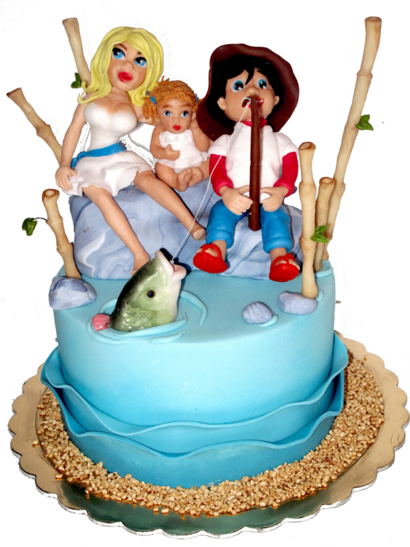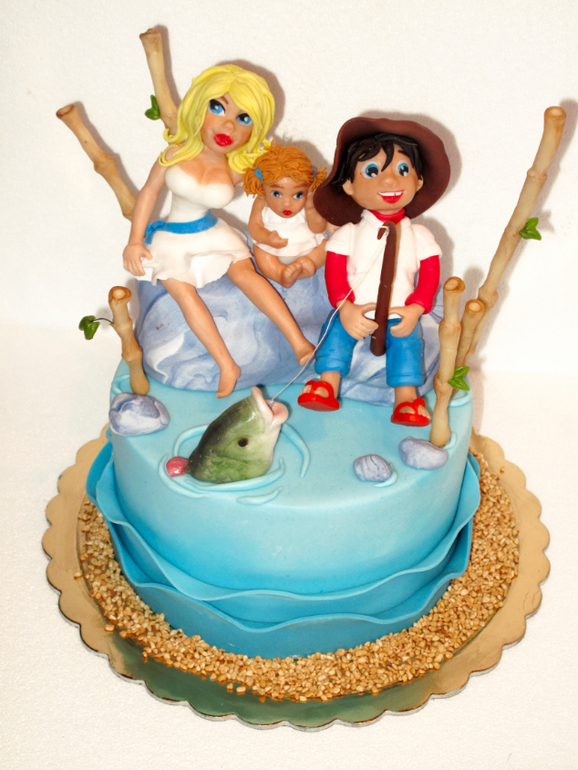 Вставлю свои 3 копейки в копилку рыбацких тортов. Торт из серии- нам такой же но с "перламутровыми пуговицами"( Присутствие блондинки и рыжей девочки было обязательным условием- так что судите сами насколько справедливо утверждение "Клиент всегда прав"( Мало того что для меня мука ацкая лепить гротескные и носопуговичные фигурки, так еще их количество меня удручает( Эх! Но как вариант пусть будет