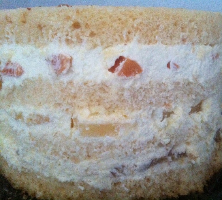 Ванильный бисквит, крем из сливок и маскарпоне, абрикосы, ананасы и бананы в карамели