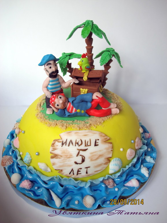 Торты детскиеПираты - извечная мальчишеская тема! На этот раз пирату Илюше на 5-летие был создан такой торт, внутри шоколадный и ванильный бисквит, малиновый мусс, вес 3,5 кг.