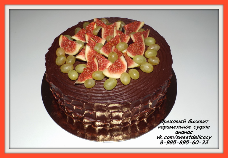 Украшение тортов кремом,шоколадом, фруктамиОреховый бисквит,карамельно-сливочное суфле,вес 2,5 кг.