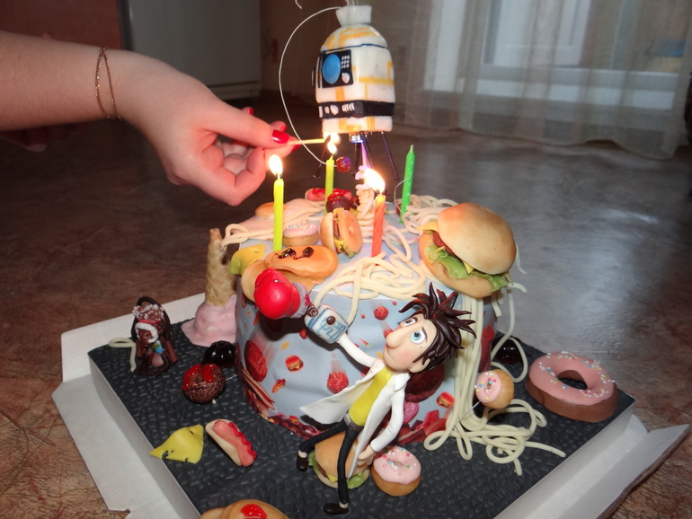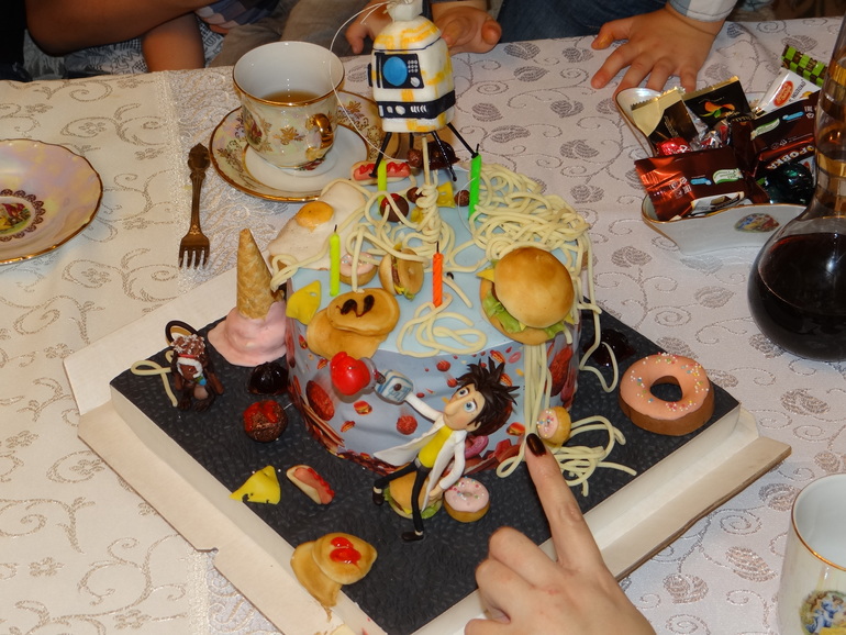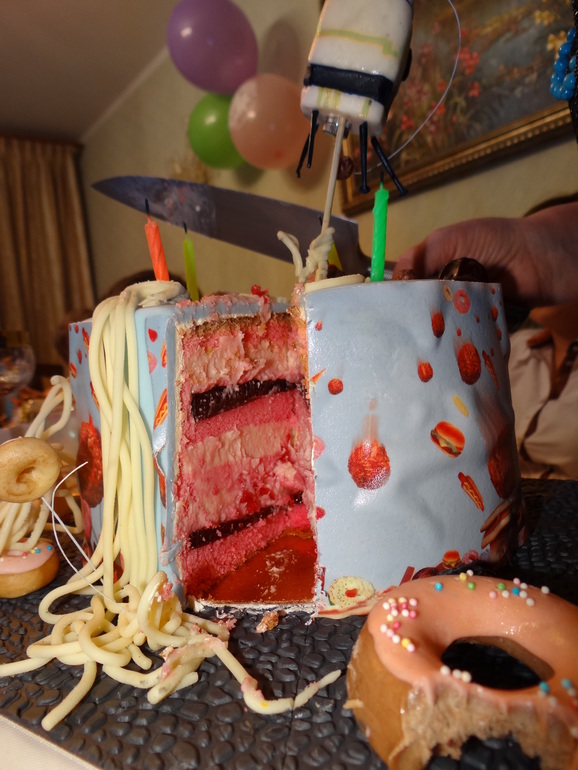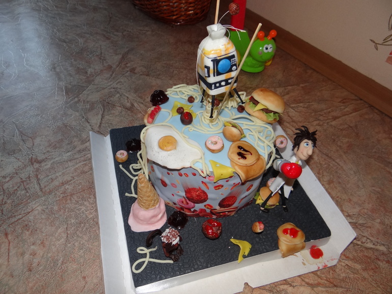 Торт получился потрясающим, все не могли понять можно ли это всё кушать! Мой дядя (а ему за 50) долго не мог понять настоящие макароны или нет, и даже когда их попробовал спросил почему они сладкие.