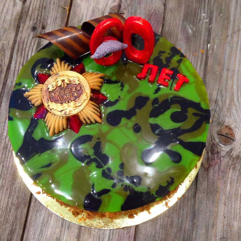 Торты для мужчинШоколадный бисквит, хрустящий слой с малиновыми криспами, манго кремю, ванильный мусс баваруа, шоколадный орден с вишней