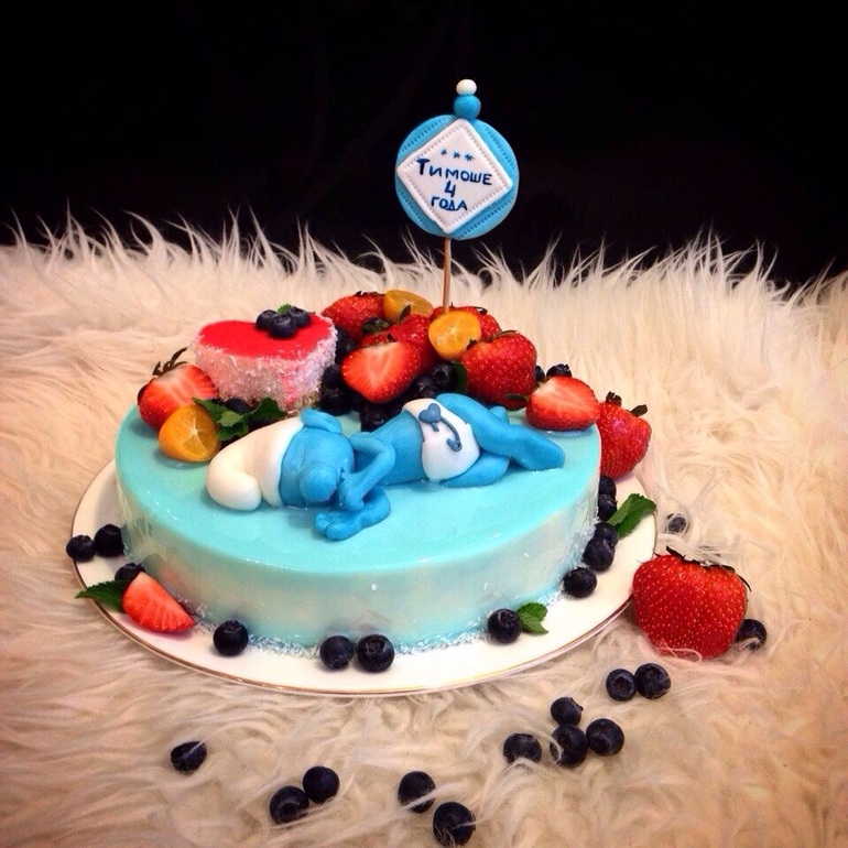 Красивые торты) Скажите, пожалуйста, а смурфик мастичный? Как мастика себя ведет на таком покрытии?