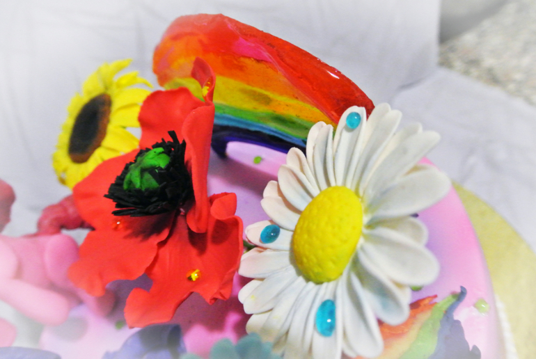 Торты детскиеЗаказчица поставила задачу: нужны Пинки Пай, Радуга Дэш и Рарити, светло-сиреневый либо светло-фиолетовый фон, радуга и ОБЯЗАТЕЛЬНО при цветка - мак, ромашка и подсолнух. В общем, необходимо буйство красок, чтобы глаза резало)). Вот, что получилось)))
