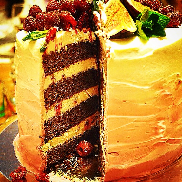Бисквит брауни, крем сливочный с малиной и декор малина и инжир. Разрез под катом
