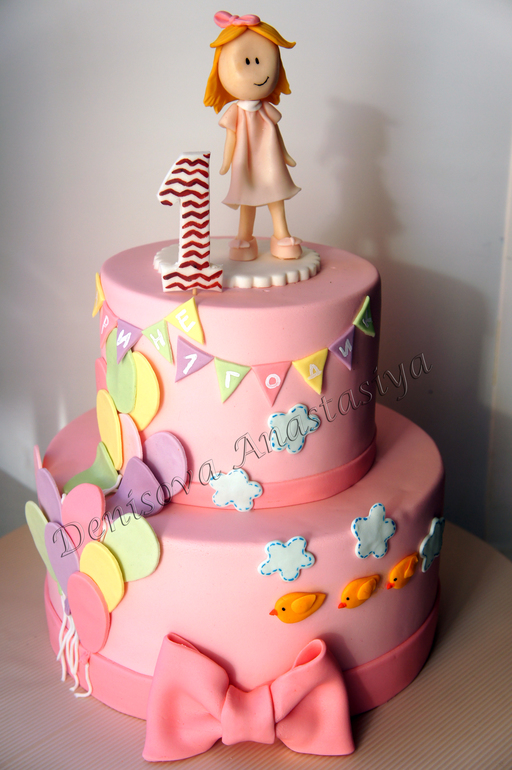 Торты детскиеНа годовасие маленькой малышки) вес 5,5 кг низ: Шоколадный мусс, шоколадный бисквит, фундук и вафельная крошка. Верх: Клубнично-банановый мусс и прослойка карамелизированных бананов ) идея заказчика)