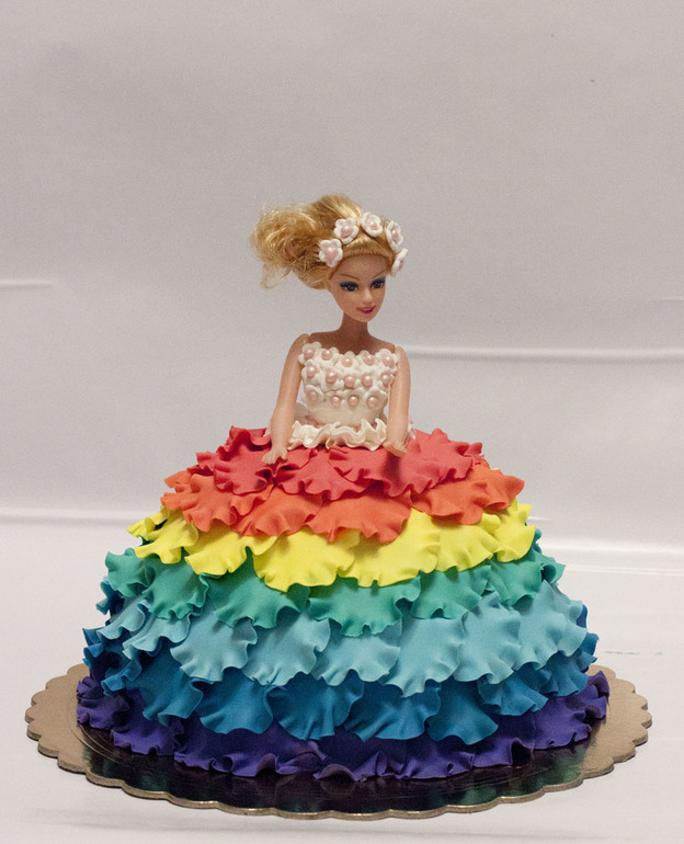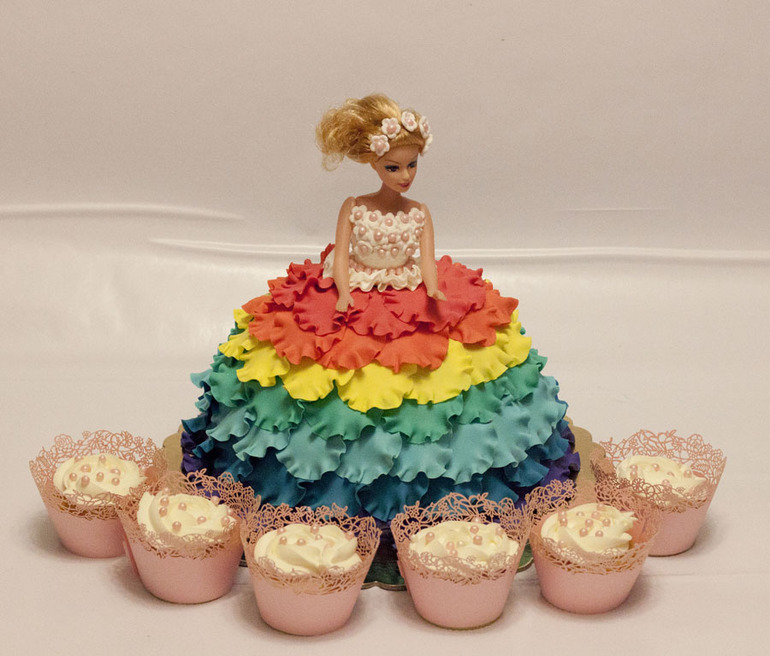 Торты детскиеКак я радуюсь возможности поиграть в куклы :). Вот такая яркая юбочка у куколки. Лиф у платья по просьбе заказчицы сделан с розовыми бусинами, уж очень обе дочки их любят. Ну, и капкейки с теми же бусинами.