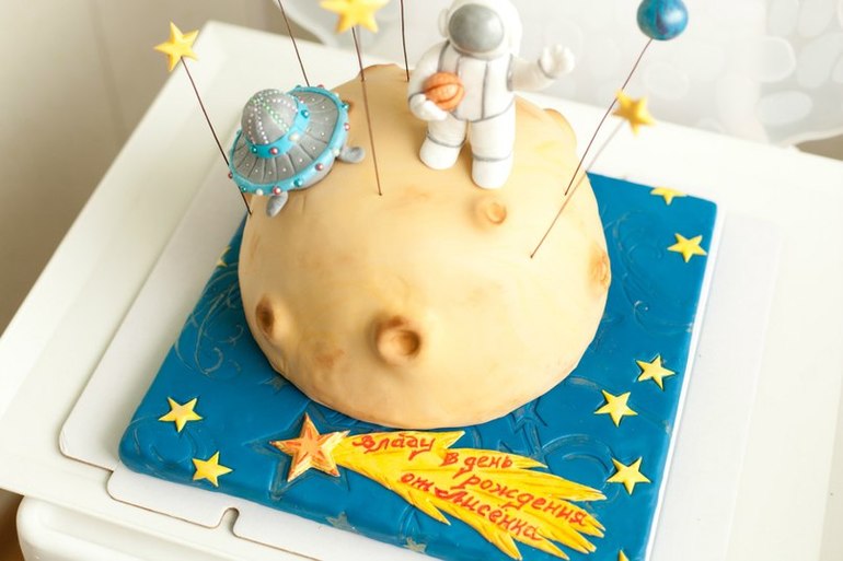ой, клевенький!еще бы планетки сделать кейк-попсами, а звездочки из изомальта, т.е. леденцами-карамельками. Тогда ваще все съедобно — клаааааасссс!!!! )))))отличное исполнение!