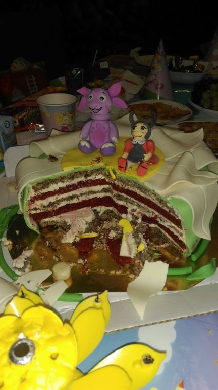 Торты детскиеТорт для ББ-шечки Екатерины) 3,4 кг. А-ля Клубничный поцелуй: бисквит с шоколадной крошкой, клубничное желе и заварной крем.