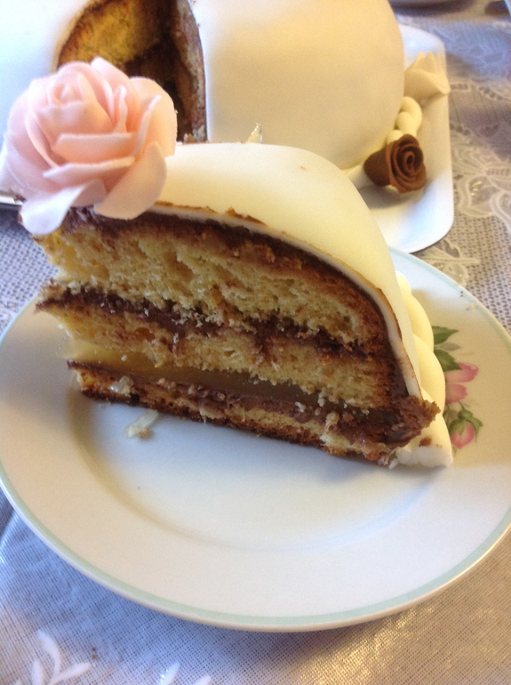В первом торте использовала магазинную мастику виллтон (все, что нашла в своем городе). Начиная с этого и все последующие торты делала с самодельной мастикой из мармышек. Внутри - молочная девочка. Очень порадовала вкусом, делала ее впервые! А старания по выравниванию, вы можете оценить по огромному слою ганаша!