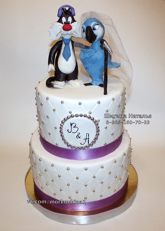 Торты свадебныеВот таких необычных попросили жениха с невестой. Он - Кот Сильвестр с большими наушниками в ушах, а она - попугай девочка из Рио с микрофоном. Любовь она такая)))))