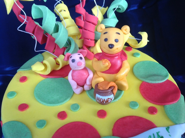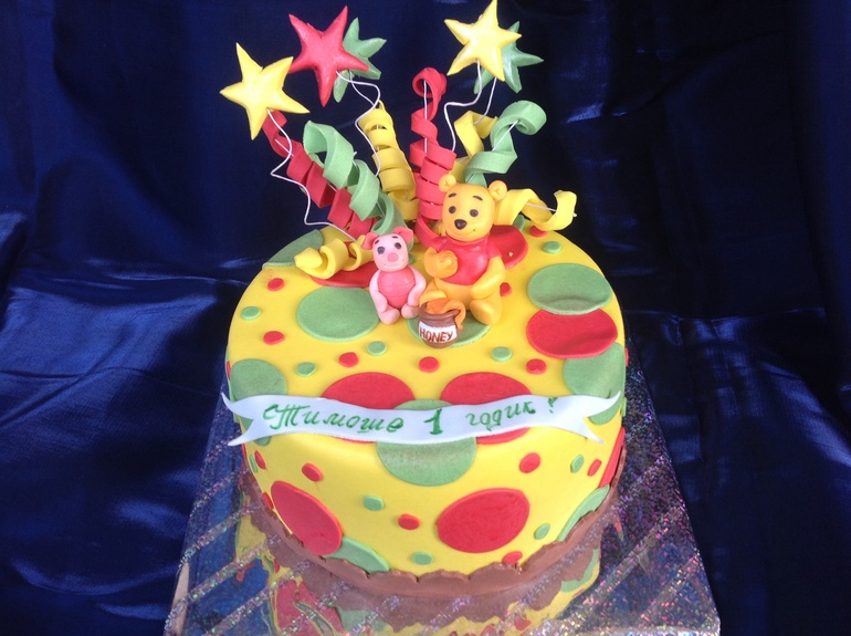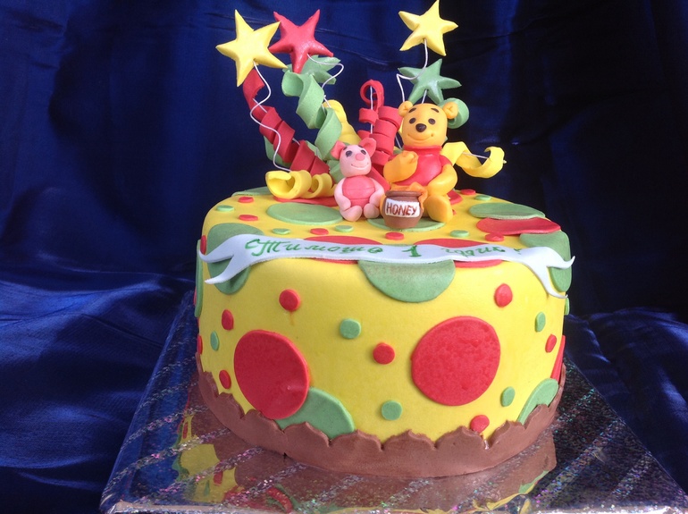 Сегодня отдала своей дорогой подруге тортик с Винни и Пяточком. Внутри бисквит с клубникой, карамелизированным бананом и сливочным кремом.