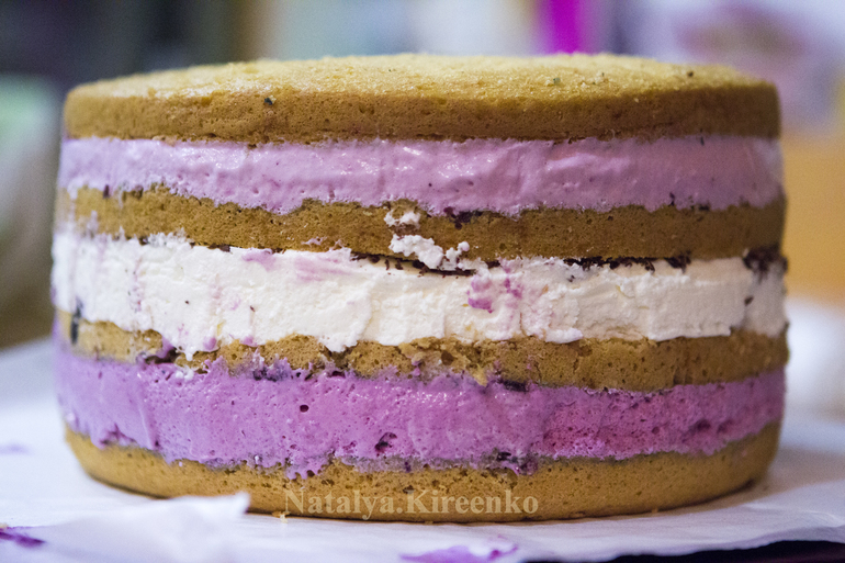 под катом начинка: голубичное суфле, много голубики (мороженой, конечно :(), в середине - сметанное суфле с миксом голубика+вишня+черника. Обалденно вкусное, мы с мужем за остатки дрались :)))