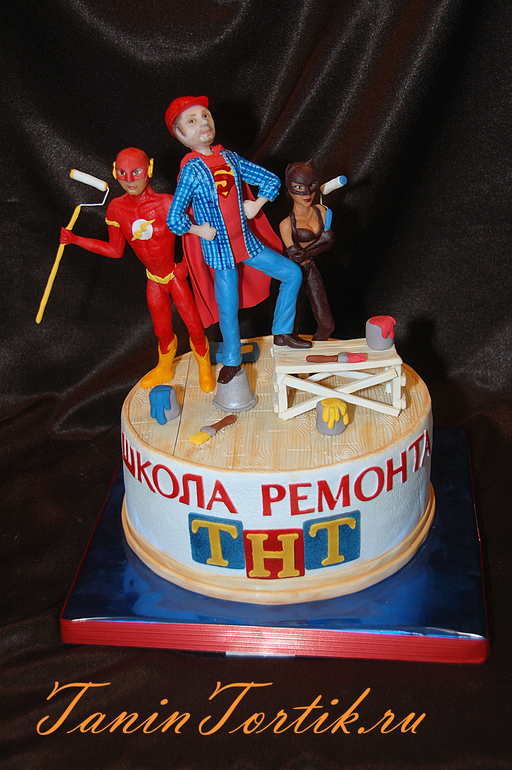 Торты тематическиеТорт заказали участники программы "Школа Ремонта" на ТНТ. Обязательным условием было наличие Сан Саныча, остальное на мое усмотрение. Конечно же дизайн согласовывался и заказчикам понравилась такая идея :) . Эфир программы 13 дкабря.