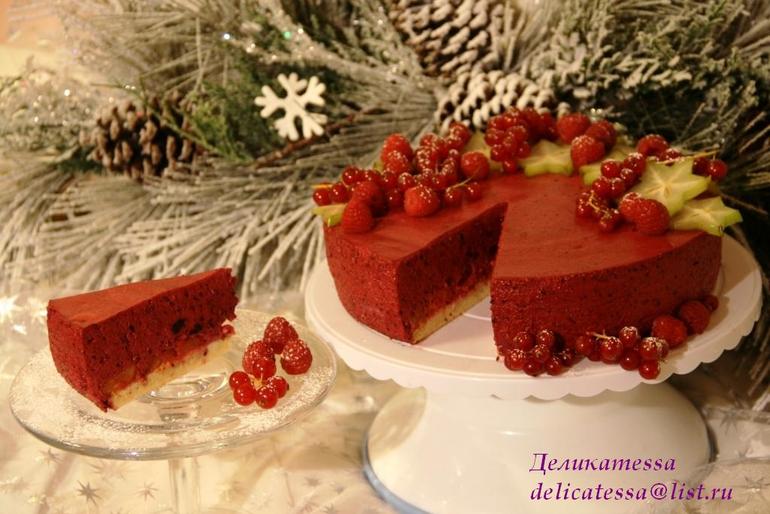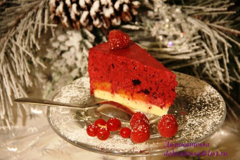 Спасибо! Если честно, как такового рецепта не существует. Делала обычное ягодное суфле, без пропорций, на глаз. В следующий раз положу побольше сливок и сахара и поменьше ягод, уж больно насыщенный ягодный вкус получился.А готовила так (количество продуктов примерное):- Выпекаем тонкий бисквит (я брала 2 яйца, полстакана муки, полстакана сахара, ванилин; взбить белки с сахаром, аккуратно вмешать желтки и муку; выпекать мин 15-20 при 180 гр). Остудить. - Размораживаем (можно не до конца) ягоды (400-450 гр), пюрируем их блендером, добавляем сахар (100 гр), лимонный сок (1/2 лимона), довести до кипения и снять с плиты. Если не любите косточки, то можно протереть через сито. - Желатин (3 ч.л.) растворить в маленьком количестве воды, влить в горячее пюре, хорошо перемешать и остудить.- Сливки (200 мл) взбить. Продолжая взбивать, по ложке добавляем ягодное пюре.- Дно разъемной формы выложить пергаментом. Сверху выложить бисквит, затем ягодное суфле. (Я еще на бисквит положила дольки апельсина, полностью очищенные от кожицы) - Убрать в холодильник на несколько часов, лучше на ночь. Аккуратно снять разъемную форму. Украсить ягодами. И съесть с друзьями))