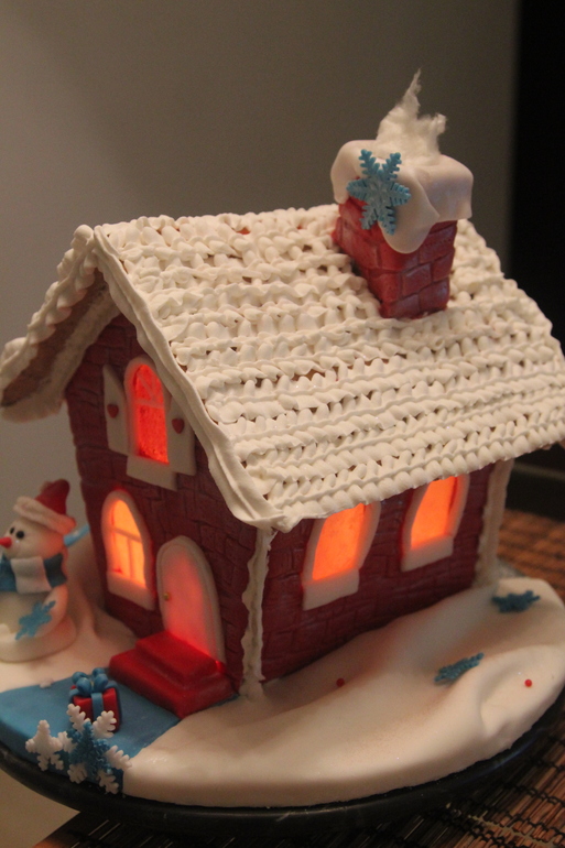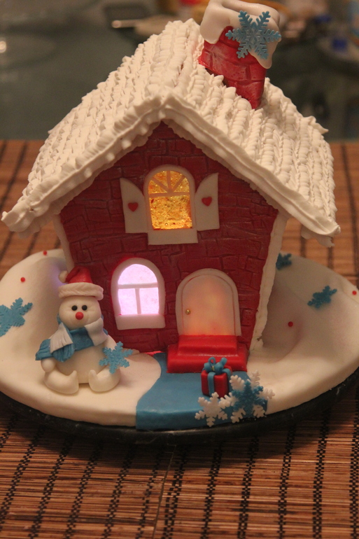 Печенье,пирожные,конфеты, выпечкаДомик украшен айсингом и мастикой, внутри гирлянда на батарейках, дымок из трубы