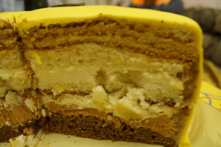 Разрезик немного неудачный, но все же: нижний торт сникерс, средний ванильный бисквит со сл-сметанным суфле и ананасами, верх медовик со сметанным кремом.