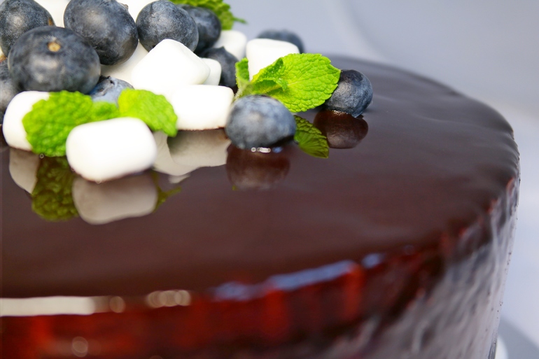 Шоколадный торт по мотивам Инны (Блю Фреска) .шоколадный бисквит,шокоганаш,пропитка ром,вишня,голубика,маршмеллоу