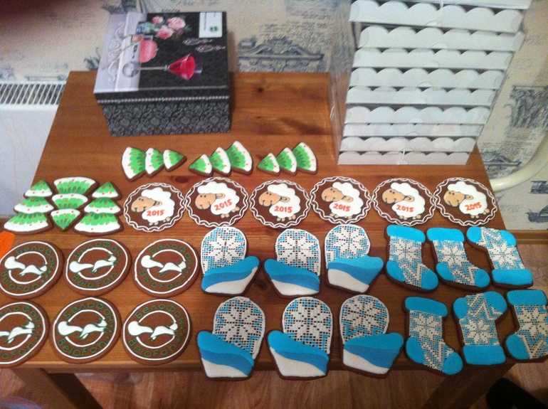 ПряникиЗаказали 80 штук, у меня получилось 150 штук)))) Ночь пекла, две ночи рисовала и все, они мне снятся в страшных снах. Не было сил фотографировать, вот быстрое фото на телефон и все. Почти все упакованы уже.