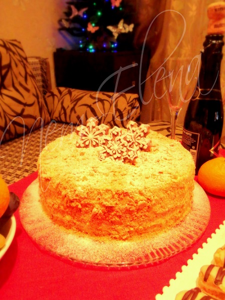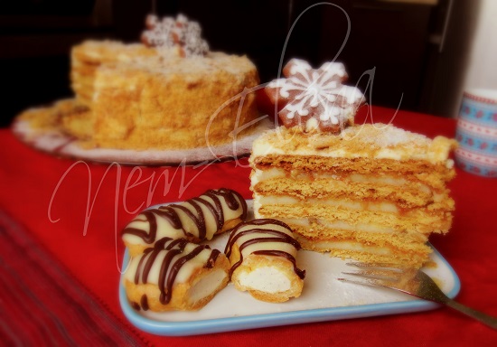 Торты для домашних и друзейКак то извращаться в украшении не было ни времени, ни сил, так что на НГ у нас был вот такой простенький, но очень вкусный "Карамельный медовик" с заварным кремом, грецкими орехами и прослойкой из мягкой карамели. Еще были эклеры с ванильным сливочным кремом.