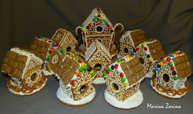 Печенье,пирожные,конфеты, выпечкавот такая получилось деревня в последние дни перед новым годом. какие - то домики с конфетами внутри, какие - то с денежными подарками для своих, но все равно все разные :))) после фото присыпыла все сах пудрой - получилось лучше. большой дом 20 см , маленькие по 10 см в высоту