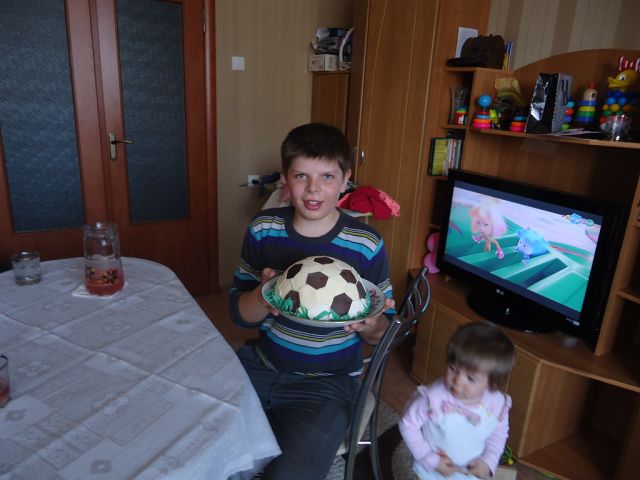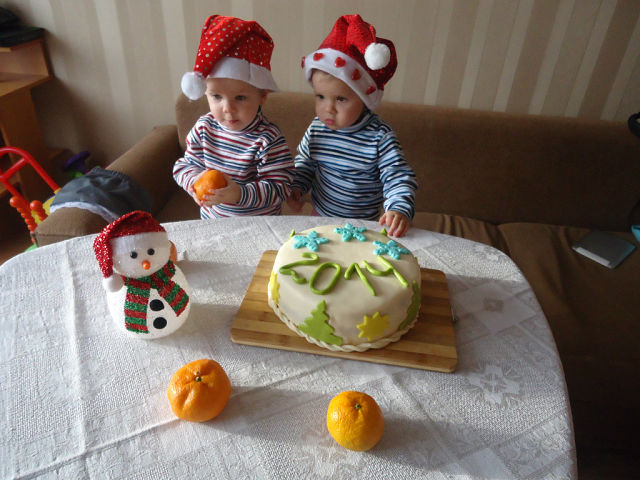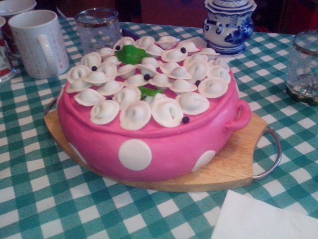 Декабрь у меня "урожайным" выдался... Пельмени лепила мужу на ДР. Этот тортик у меня вообще неудалый. Испекла бисквит, положила на стол остывать. Сама пошла в комнату телек посмотреть, мелкие на кухне мультики смотрели. И тут идет Ксюха с полным ртом и в руке кусок бисквита несет. Лечу на кухню... Бисквит мой на полу, верх весь погрызан и сбоку вырван кусок. Яиц в холодильнике больше нет, сын на улице, телефон не отвечает, в магазин не выйти. Хоть плачь... Пришлось маскировать кремом то, что осталось.