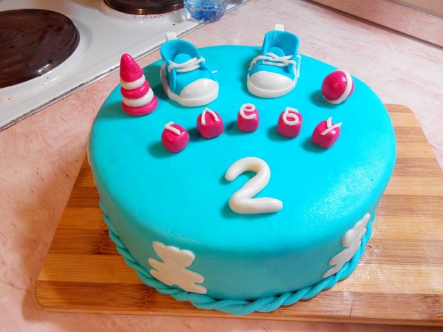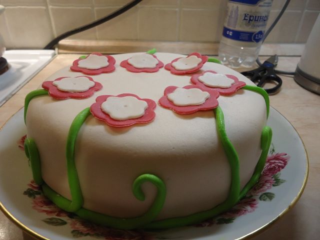 Этот тортик самый первый. Мастику делала из Малютки, на вкус не очень понравилась. На всех остальных из маршмеллоу.