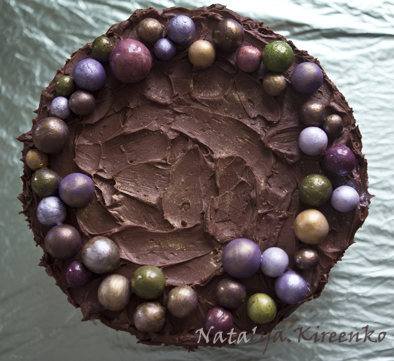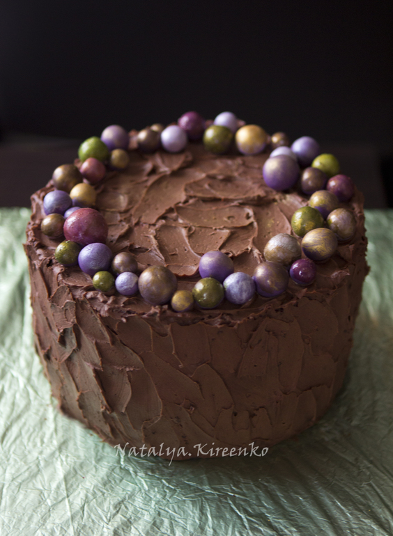 Украшение тортов кремом,шоколадом, фруктамиШоколадный бисквит, сметана, вишня, сверху масляный шоколадный крем. Декор - мастичные шарики, покрытые разным золотишком :) Спасибо Конфетке и Фисе, это я у них подсмотрела :) Ну а декор торта мазками давно лелеяла, наконец воплотила - очень понравилось !