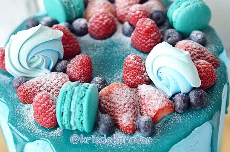 Голубой с мятно-лимонной глазурью, ягодами, меренгами и макарон :)))
