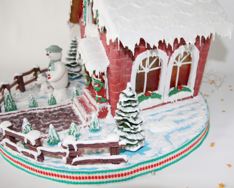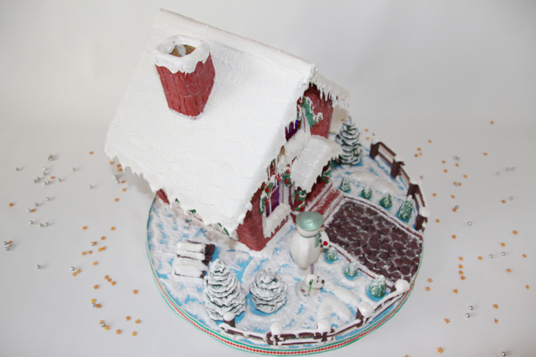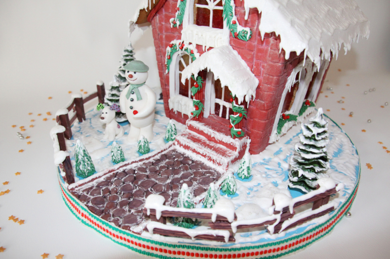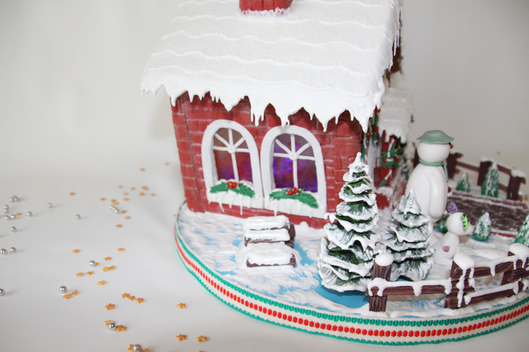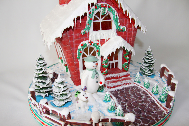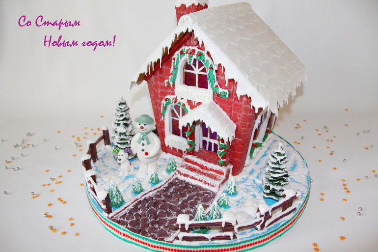 Печенье,пирожные,конфеты, выпечкаХоть и к старому, но всё-таки Новому году у меня доделался вот такой пряничный дом. Пряничные коржи покрыты мастикой и айсингом. Снеговичка и собачку лепила с героев очень милой и трогательной рождественской сказки "Снеговик и снежный пёс". В окошках горит свет.