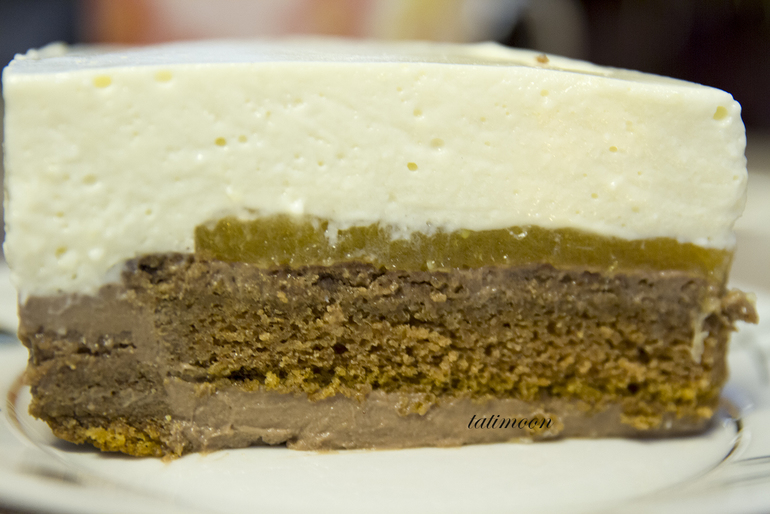тыквенный бисквит, крустилант с миндалем, намелака с имбирем, корицей и молосным шоколадом, мандариновое конфи и медовый мусс. Это бомба!!!! Хочу еще... Разрез внешне не идеальный, но и условия у меня такие же были...... приходилось формы делать из фольги... каникулы в Простоквашино удались))))