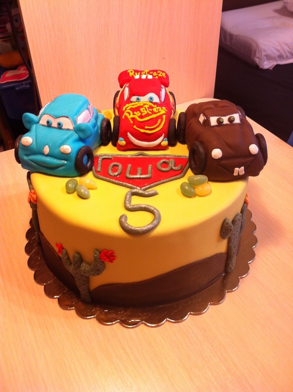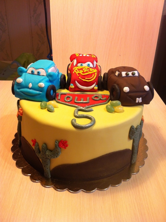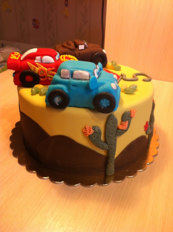 Очень славный тортик! Машинки на акты маленький, конечно, лучше не из картошки делать, чтобы размер соблюсти. А так очень классные для первых ;)
