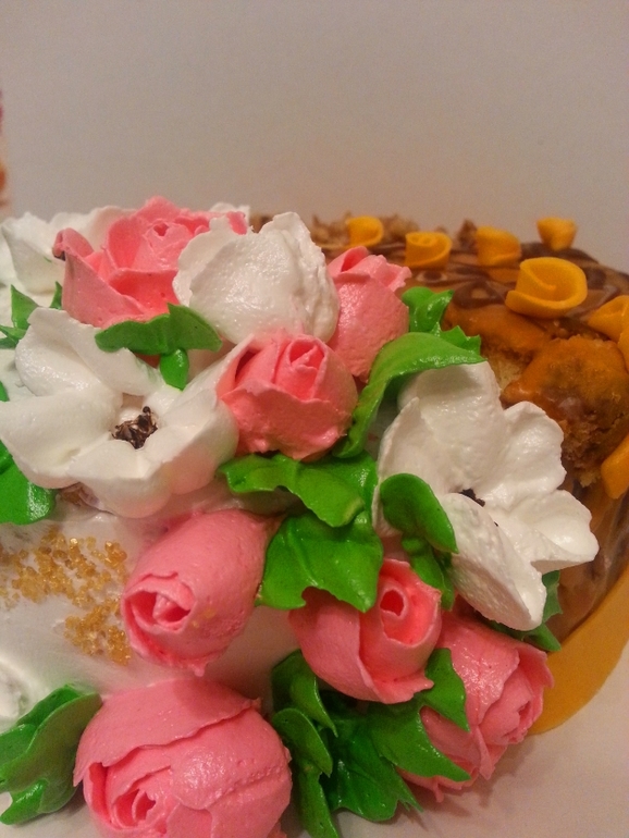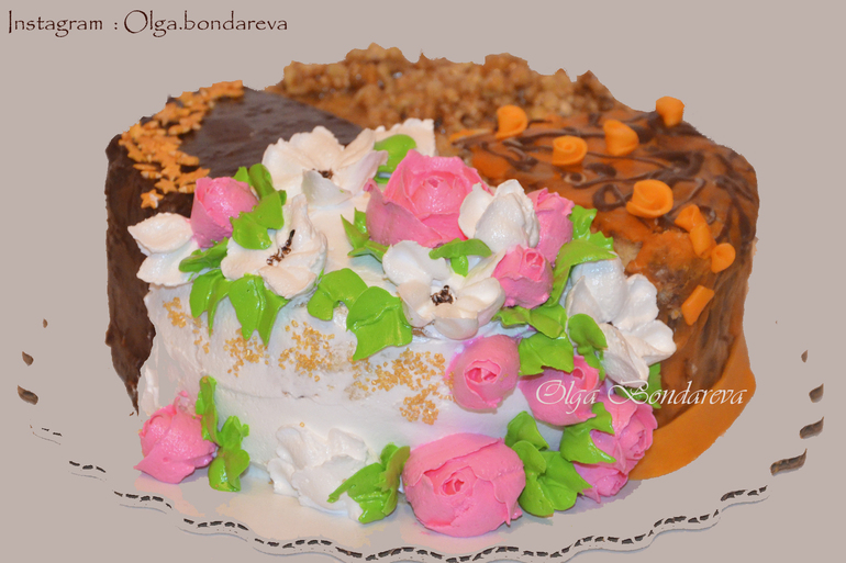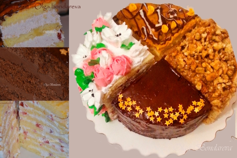 Вкусы были следующие: 1. Легкий шифоновый бисквит со сливочно-творожным кремом, пюре ежевики и кусочками коктельной вишенки.2. Молочная девочка, которая нравится всем:) Сливочный крем и маленькие квадратики клубники в желе.3. Рыжик-мягчайший, таящий. Сметанно-сливочный крем с вареной сгущенкой и грецкими орехами в карамели.4. Прага с горьким шоколадом, пропитанная ромом. Декор-апельсиновый, молочный, белый шоколад, мастичный декор, швейцарская меренга.