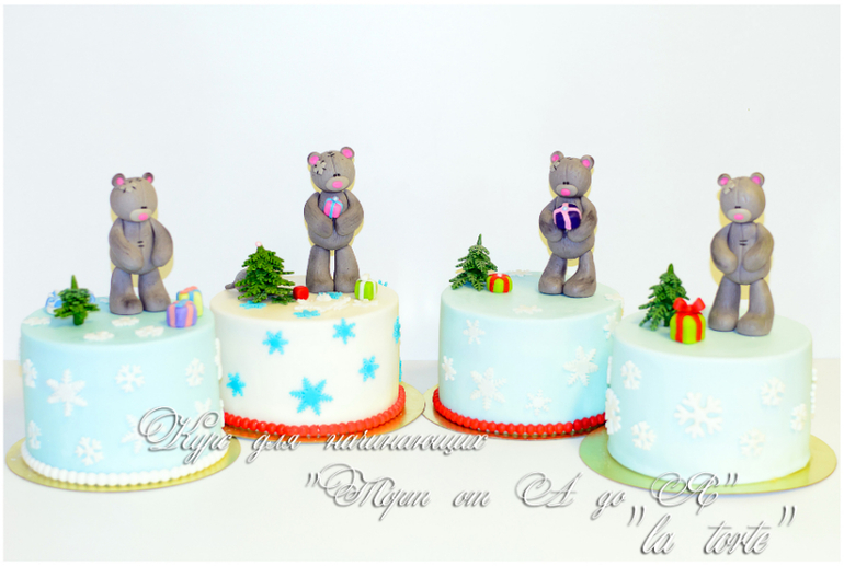 Как всегда, атмосфера курса была очень уютная и теплая, а т.к. приближался Новый год, то еще и немножечко волшебная)). Каждый участник курса создавал свой съедобный тортик. Все делали самостоятельно, начиная от резки коржей, приготовления крема до декора, лепки фигурок. Кроме основной программы, я успела ответить на многие интересующие вопросы. Вот, что у нас в итоге получилось!