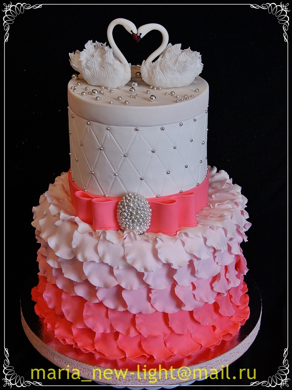 а мне нравится! Все красиво- лепестки, бантик, брошка, лебеди. И сами ярусы ровненькие. Молодец!