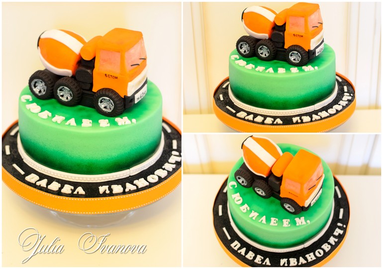 Я заказала у Юлии торт на юбилей своего свекра. Пожелания были необычные - нужен был торт в виде машины-бетономешалки. Плюс торт нужен был к 3 января и желающих поработать в праздник нашлось очень мало:-) Точнее вообще не нашлось, Юлия была первой, кто согласился :-)